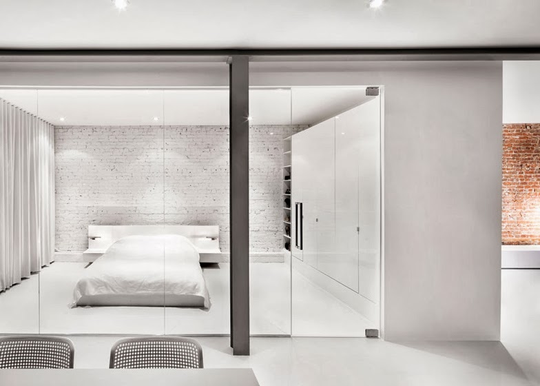 The complete renovation of this Montreal apartment by Canadian designer Anne Sophie Goneau showcases the beauty of its original exposed brick and hemlock walls, set off by polished white finishes and glass. The open kitchen with sleek black cabinets is designed to be the focus of the space, while the owner's large collection of books and a green velvet sofa add touches of colour to the minimalist home. Serene. More here on Dezeen.